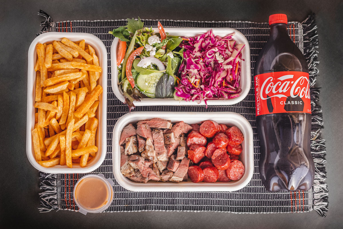500gr of Two BBQ meats, large chips, large salad, Flame smoked mayo + 1.25l Soft Drink